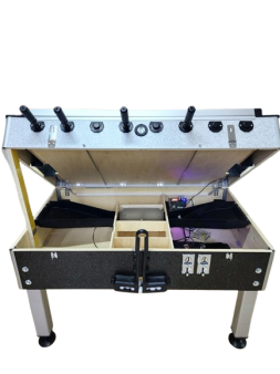 Full tornado langırt masası ürünümüz gövde olarak 25 mm kalınlığında kontrplak malzemeden imal edilmiştir. Masamızın kolları 18 mm çapında 2 mm et kalınlığında çelik çekme krom kaplamalı borudur. Bu borunun üzerine kaliteli plastikten oyuncu bebekleri plastik enjeksiyon yöntemiyle basılmaktadır. Bu masamızda oyuncu bebekleri özel yapılmış tornado modelidir. Masa kollarımız teleskopik koldur. Ürünümüzün üstü topun dışarı kontrolsüzce gitmesini önlemek amacıyla 4 mm kalınlığında tamperli cam kullanılarak kapatılmıştır. Masamızın saha zemininde de oyun kalitesini arttırmak amacıyla yine 4 mm kalınlığında tamperli cam kullanılmıştır. Ayaklar özel alüminyum profildir ve krikoludur (Masa yüksekliği ve dengesini ayarlamak amacıyla). Oyun sahası led aydınlatmalıdır. Çift elektronik para kanallıdır. Dijital skor göstergesi ve 4 büyük takımın marşlı tezahürat full langırt masamıza ayrı bir renk ve heyecan katmaktadır.